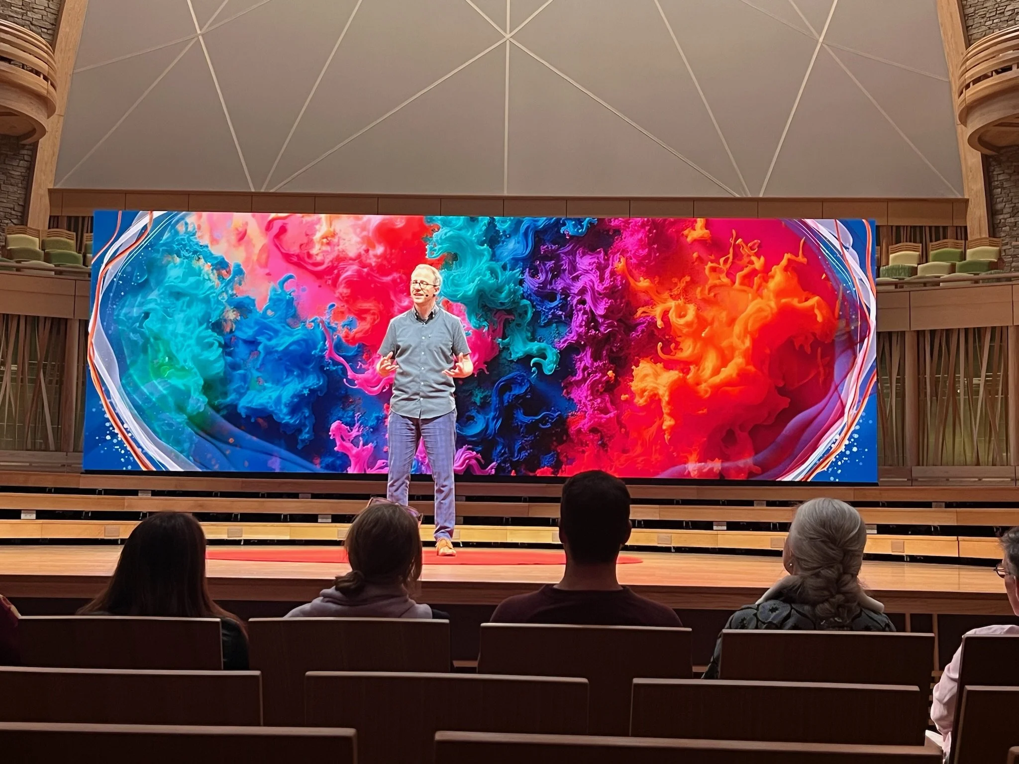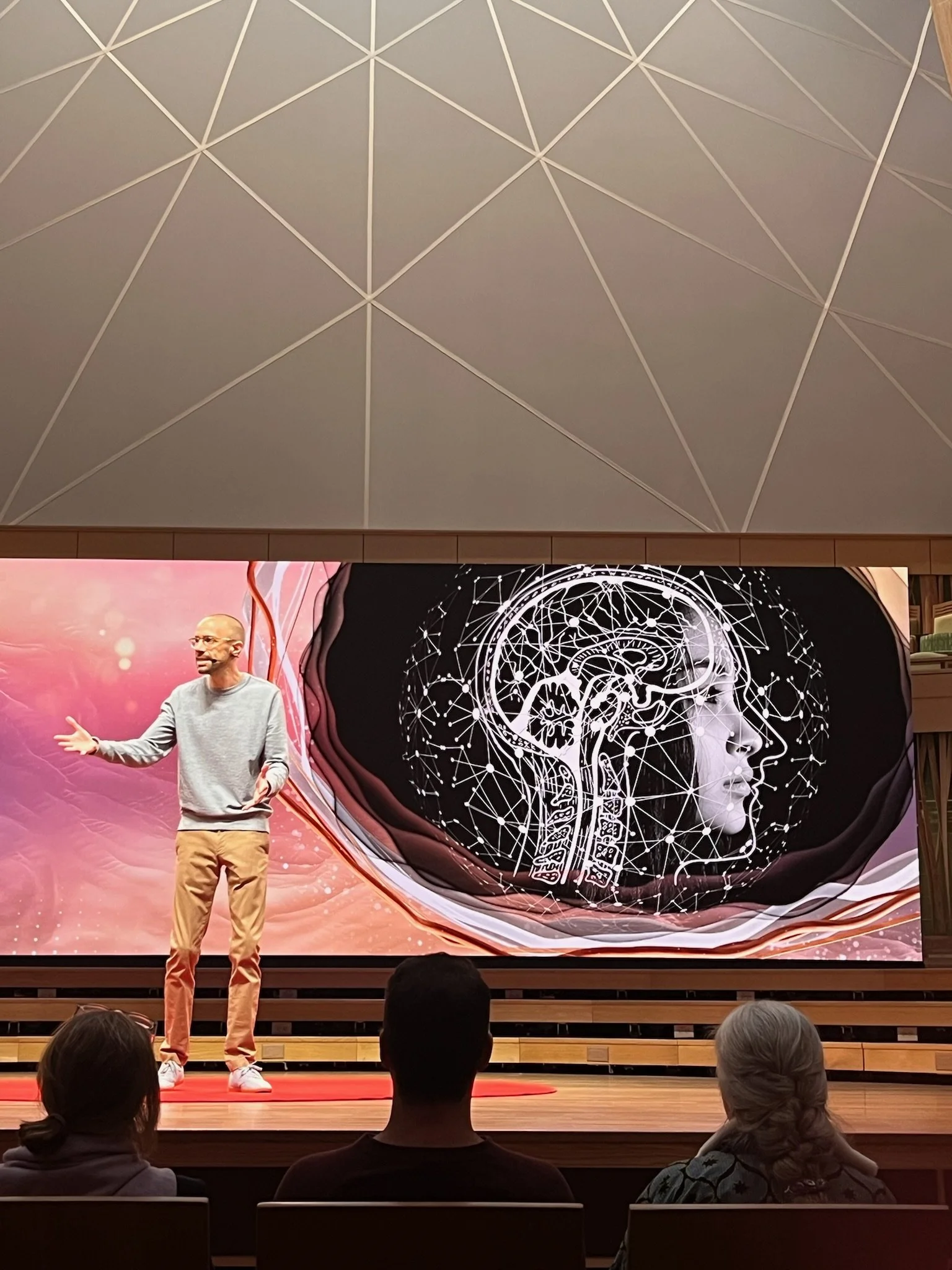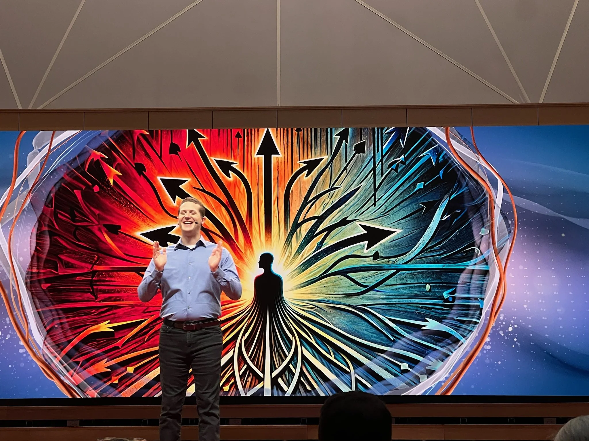 The visual representations on the screen integrated beautifully with the space itself, playing on sensibilities of light woods, subtle pastel colors, modern fixtures and parametric structural accents. From full screen imagery to content mortise frameworks…the animations ebbed and flowed between topics, connected the themes of Life and Mind, and provided a stunning backdrop for each presenter.
